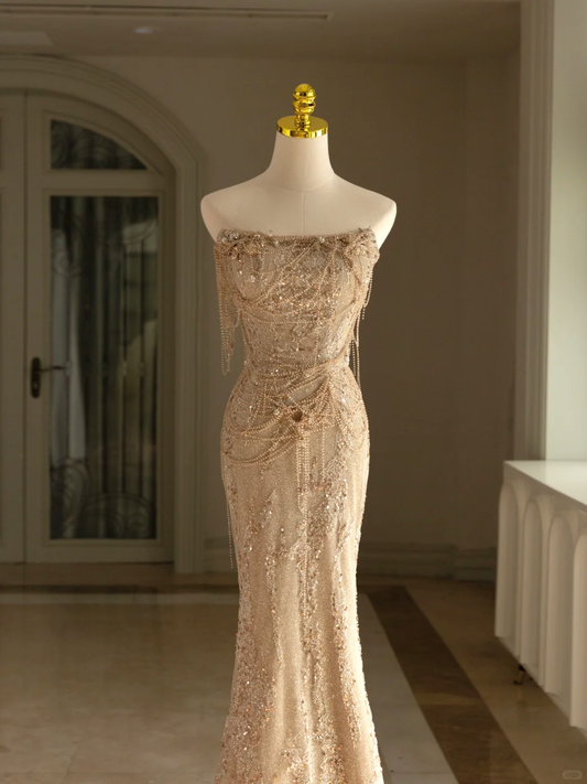 Sexy Mermaid Strapless Gold Sequin Long Prom Dresses Party Dress 20th Birthday Outfits Graduation Dresses DH1300