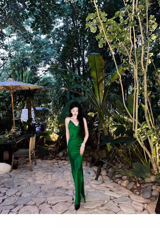 Sexy Sheath Spaghetti Straps Green Backless Satin Long Prom Dresses Party Dress 20th Birthday Outfits Graduation Dresses DH1886