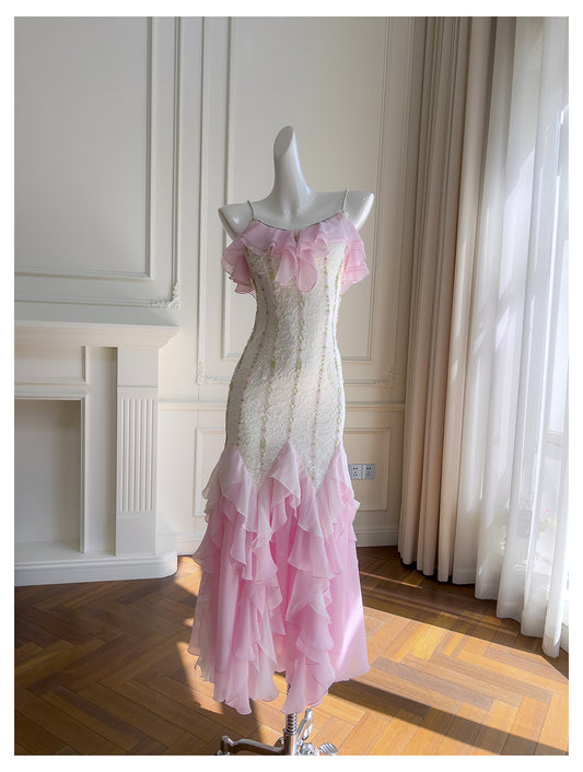 Sexy Mermaid Spaghetti Straps Pink Chiffon Long Prom Dresses Party Dress 20th Birthday Outfits Graduation Dresses DH2116