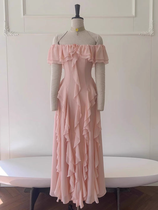Sexy A Line Off The Shoulder Blush Pink Chiffon Long Prom Dresses Party Dress 20th Birthday Outfits Graduation Dresses DH2119
