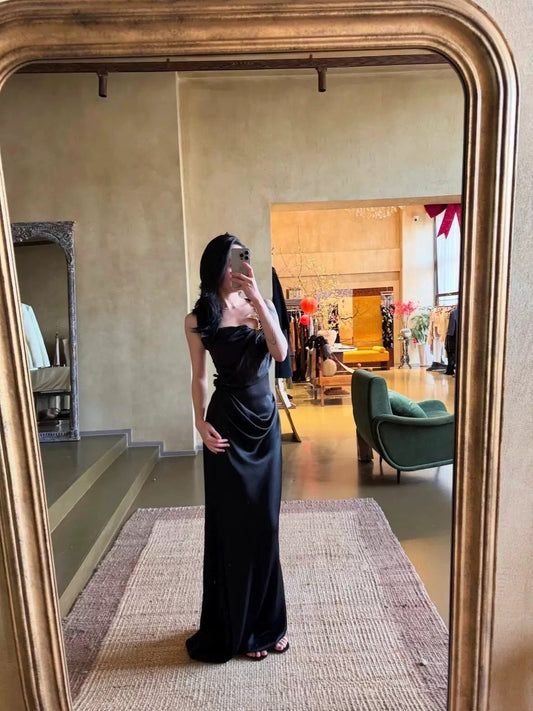 Classy Mermaid One Shoulder Black Satin Long Prom Dresses Party Dress Birthday Outfits Graduation Dresses W0763