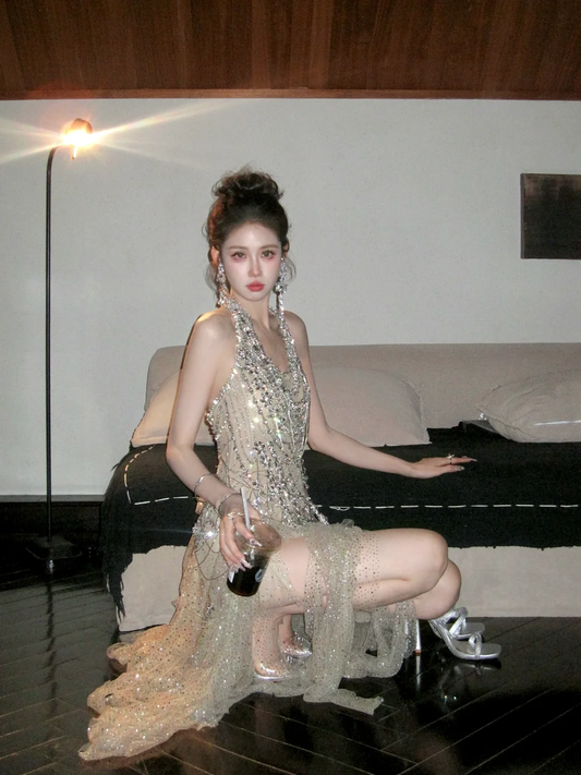 Classy Mermaid Halter Sequin Champagne Tulle Sequin Long Prom Dresses Party Dress Birthday Outfits Graduation Dresses W083