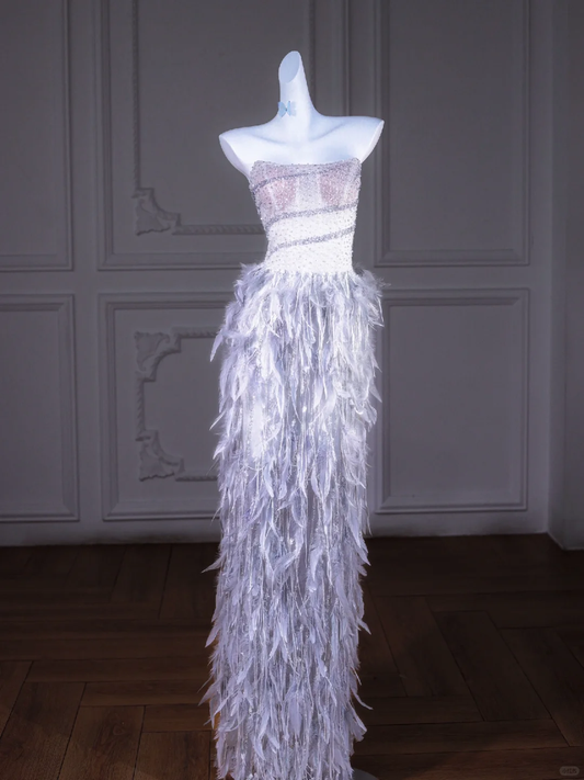 Gorgeous Mermaid Strapless Blue Sequin Long Prom Dress Party Dress Graduation Dresses With Feathers DP1963