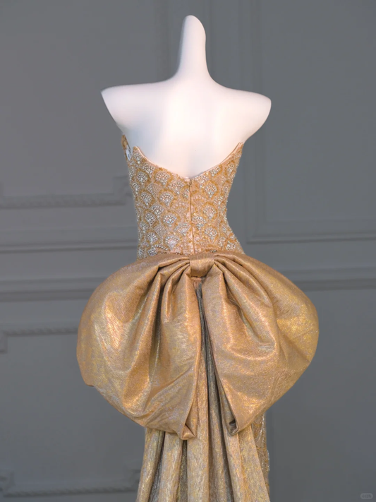 Gorgeous Mermaid Sweetheart Gold Sequin Long Prom Dress Party Dress Graduation Dresses With Bow-knot DP1985