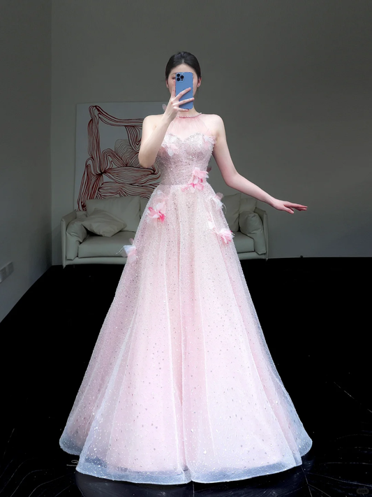 Stunning Ball Gown High Neckline Pink Sequin Long Prom Dress Party Dress Graduation Dresses DP868