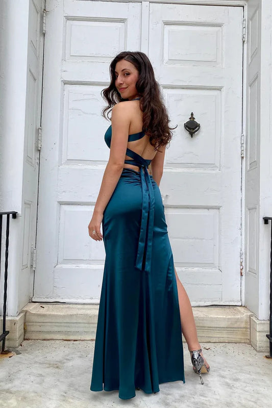 Classy A line Halter Blue Sleeveless Hollow pleated long Prom dresses Graduation Dresses DP521
