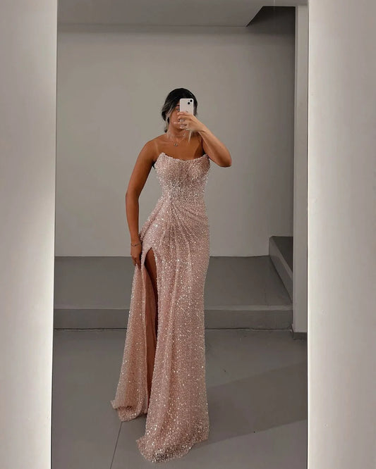 Classy Classic Strapless Sleeveless Mermaid Evening Gowns With Split Sequins Long formal Dress DP492