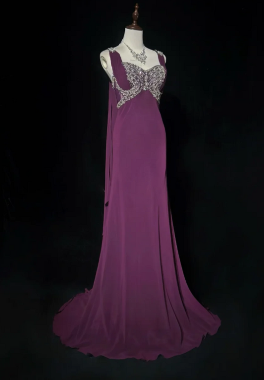 Vintage Strap Sheath Long Prom Dresses Elegant Rhinestone Chiffon Grape Evening Dresses DP3695