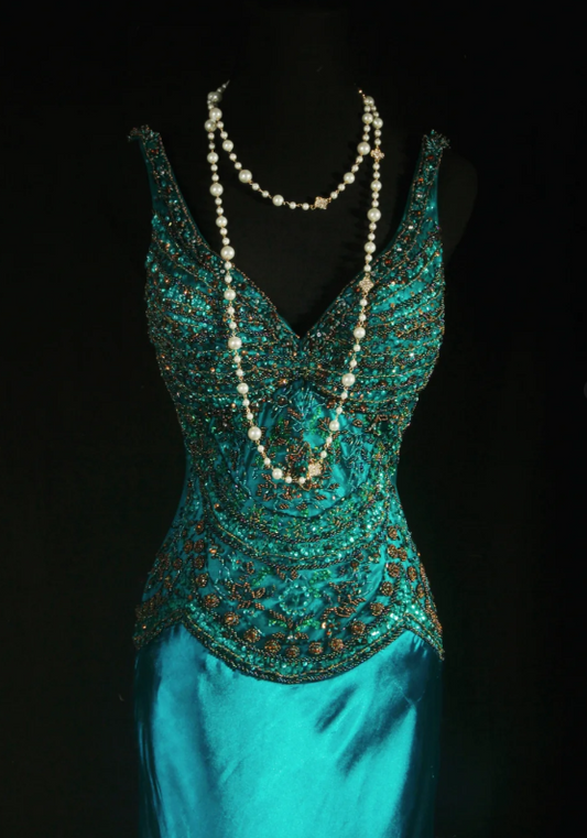 Vintage V-neck Sheath Blue Long Prom Dresses Satin Beaded Blue Evening Dresses DP3770