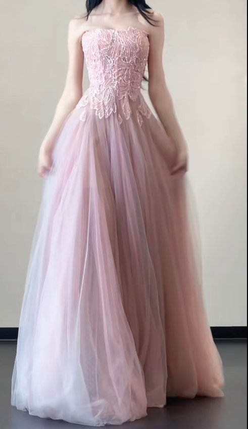 Gorgeous Strapless A-Line Long Prom Dresses Tulle Pink Sweet 16 Dresses DP3273