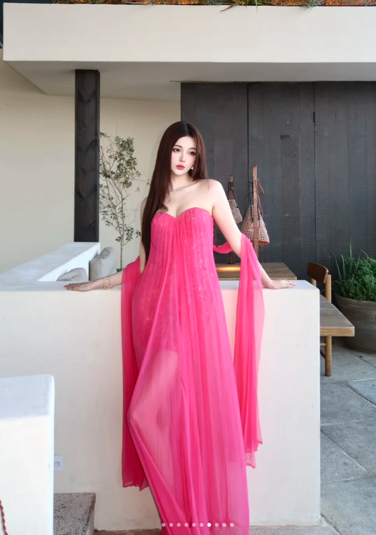 Sexy Sweetheart Neck Sheath Long Prom Dresses Chiffon Fuchsia Evening Dresses DP3373