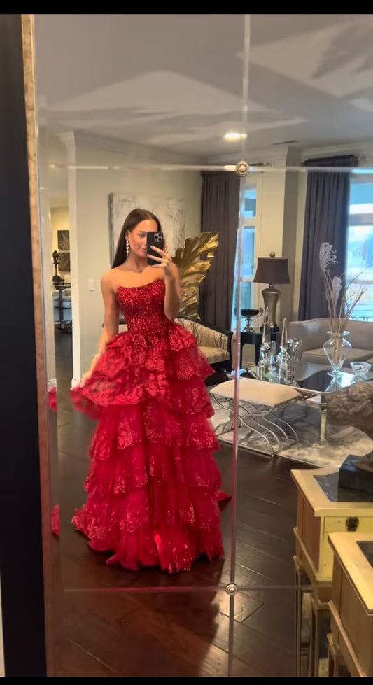 Elegant Ball Gown Strapless Red Lace Tulle Long Prom Dresses Party Dress 22th Birthday Outfits Graduation Dresses DH1372