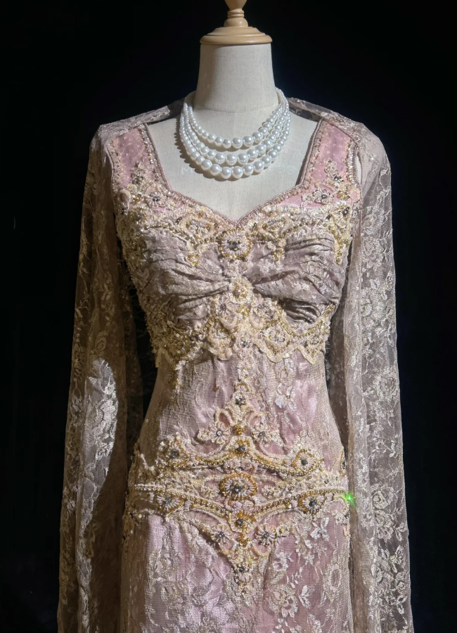 Gorgeous Pink Long Prom Dresses Beaded Lace Queen Anne Sheath Evening Dress Sleeveless Formal Dress DP04903