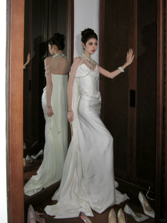 Pretty Wedding Dresses Mermaid Straps White Pearls Long Wedding Dresses Simple Bride Dress Bridal Gowns DH1545