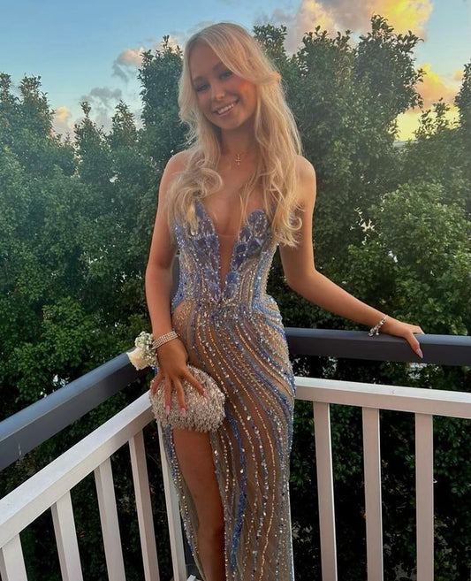 Sexy Mermaid Strapless Beads Champagne Slit Long 23rd Birthday Dress Birthday Outfits Graduation Dresses D2668
