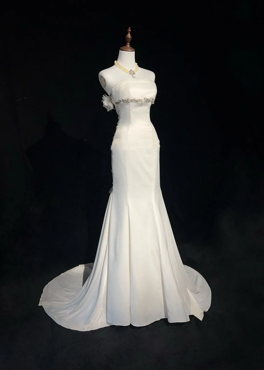 Unique Bridal Gown Mermaid Strapless Lace Sleeveless White 50s Wedding Dresses Modest Bridal Gowns DH1103