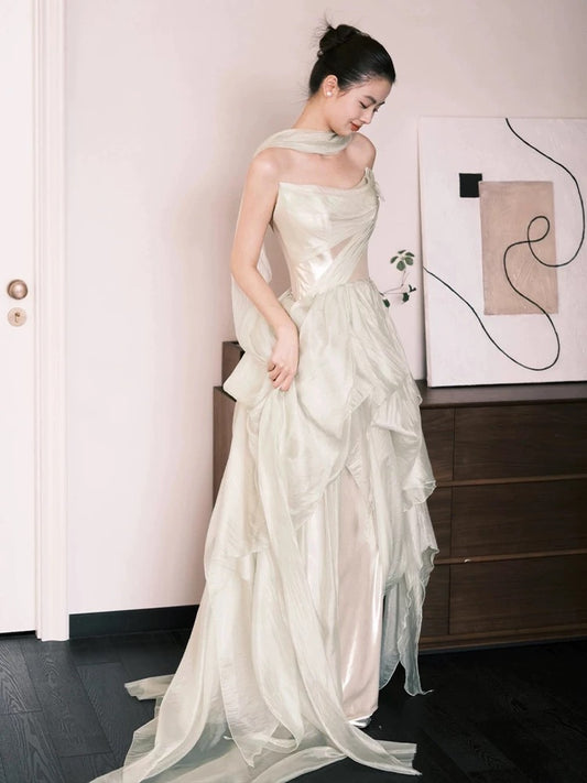 Modest Mermaid White Satin Formal Prom Gown Summer Wedding Guest Dress Bridal Guest Dresses Wedding Outfits For Guest W0717