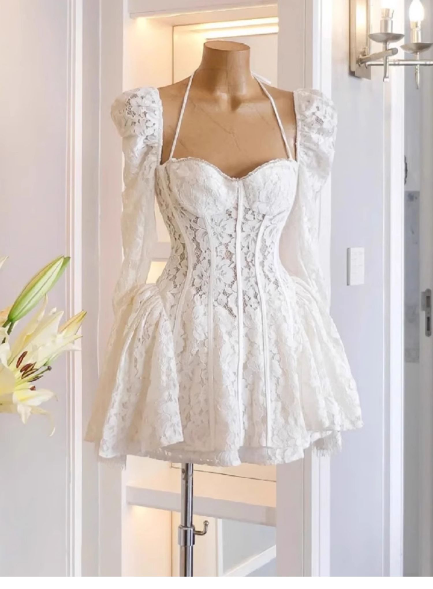 Cute A line Sweetheart Short Long Sleeves Lace White Summer Birthday Dress Hoco Dress Mini Birthday Outfit 21st Birthday Party Dresses DP1727