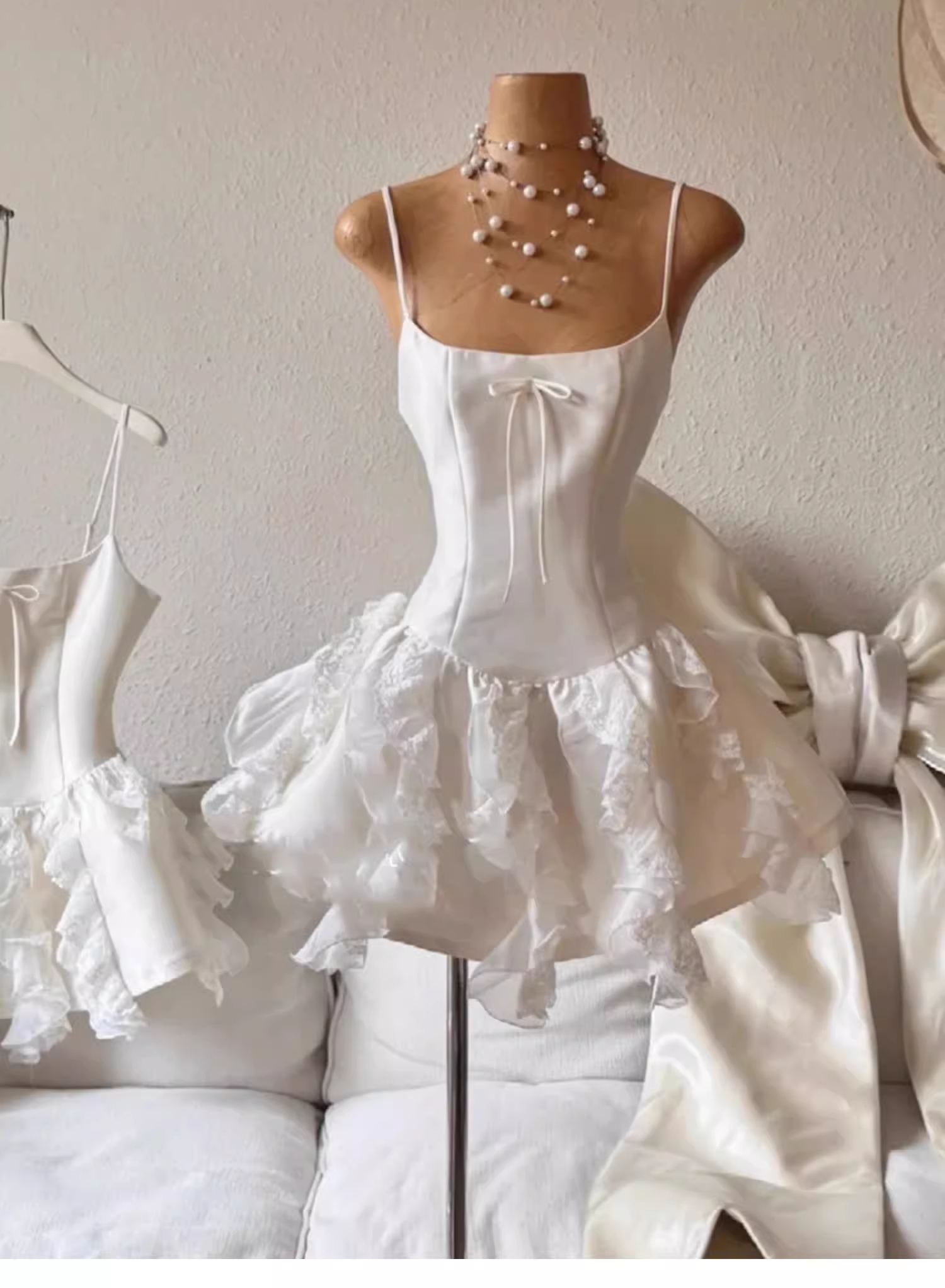 Pretty A line Spaghetti Straps White Satin Short Formal 8th Grade Homecoming Dresses Summer Middle School Hoco Dress Homecoming Outfits DH639
