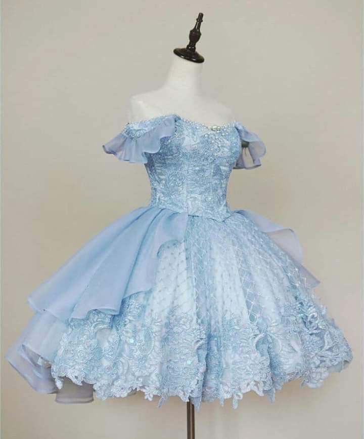 Pretty Ball Gown Off The Shoulder Light Sky Blue Lace Short Formal 8th Grade Homecoming Dresses Summer Middle School Hoco Dress 6th Grade Graduation Outfits DH285