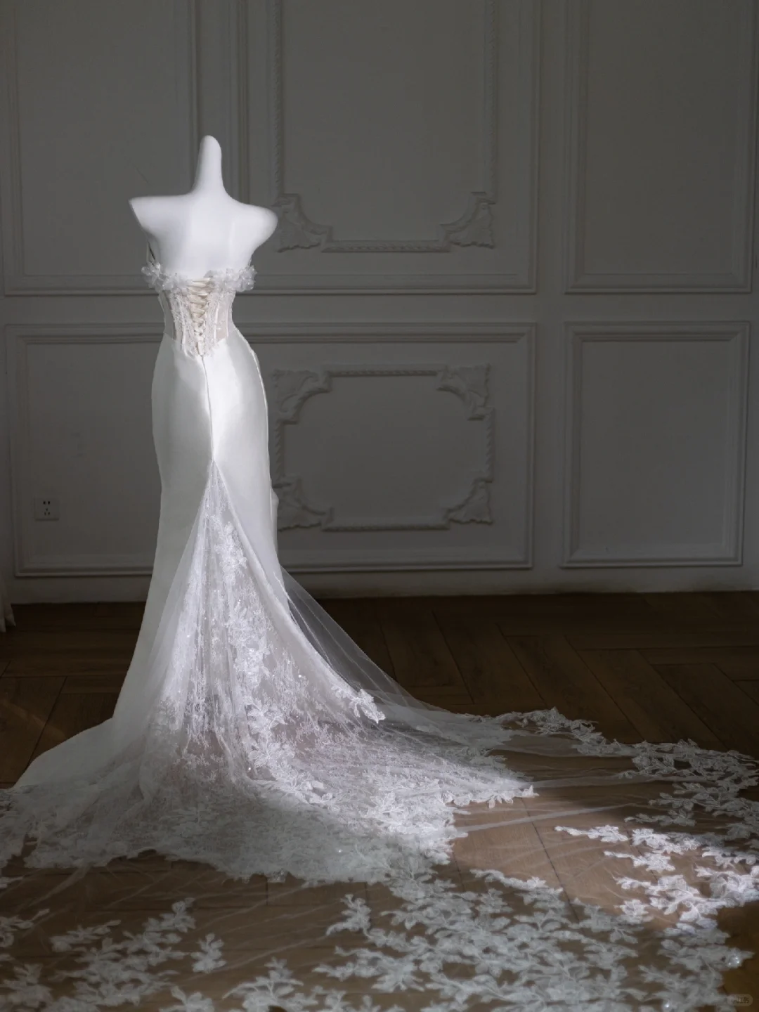 Retro Wedding Dress Mermaid Strapless Long Satin White Floral Wedding Dresses Bridal Gowns DP1852