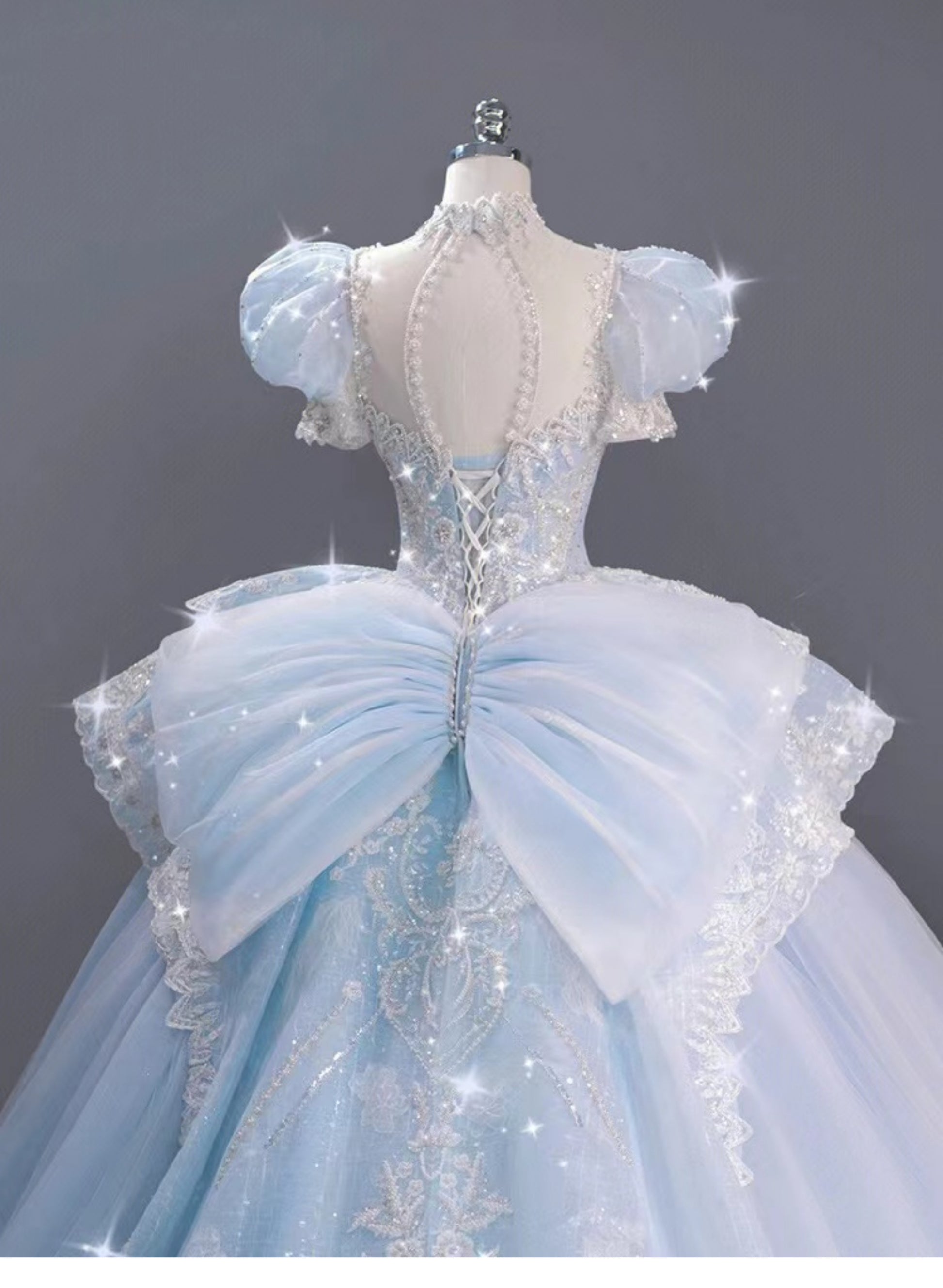 Romantic Bridal Gown Ball Gown High Neck Blue Lace Long Wedding Dresses Minimalist Bridal Gowns DH107