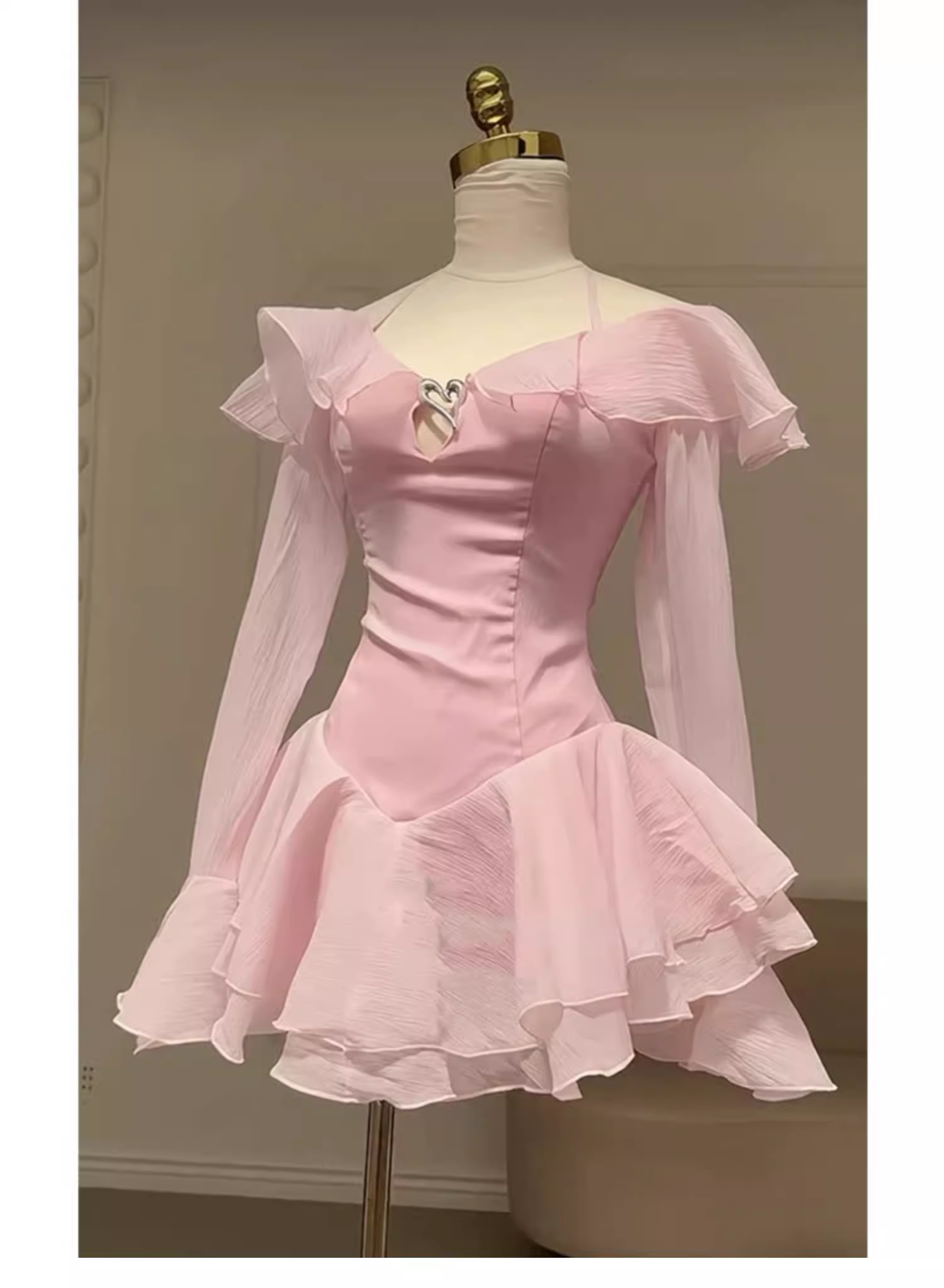 Simple A line Off The Shoulder Pink Chiffon Short Mini Homecoming Dress Summer Hoco Dresses Mini Cocktail Dress DH627
