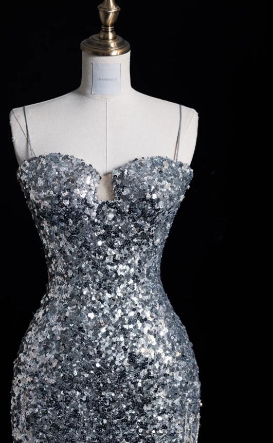 Elegant Spaghetti Straps Mermaid Long Prom Dresses Silver Sequin Formal Dresses Sleeveless Evening Dresses DP3277