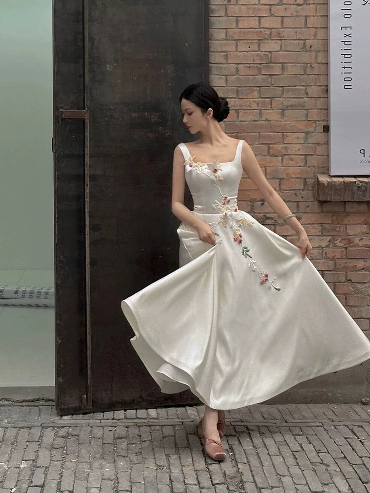 Sexy A line Square White Sleeveless Prom Dresses Party Dress Summer Birthday Outfits Birthday Dresses W806