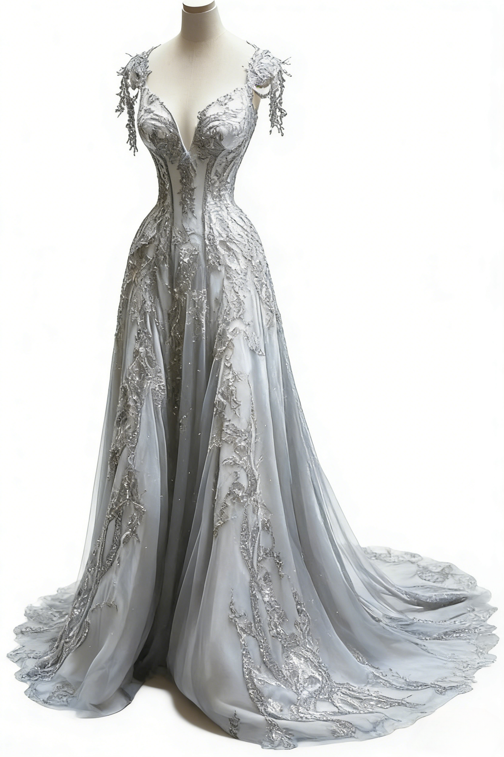 Chic Light Gray Long Prom Dresses Tulle Straps A-Line Evening Dresses DP04764