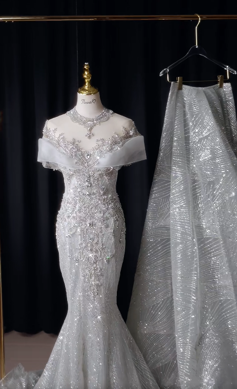 Modest Mermaid Long Wedding Dress Beaded Tulle Off-shoulder White Bridal Gown Cup Sleeves Bridal Dress DP04804