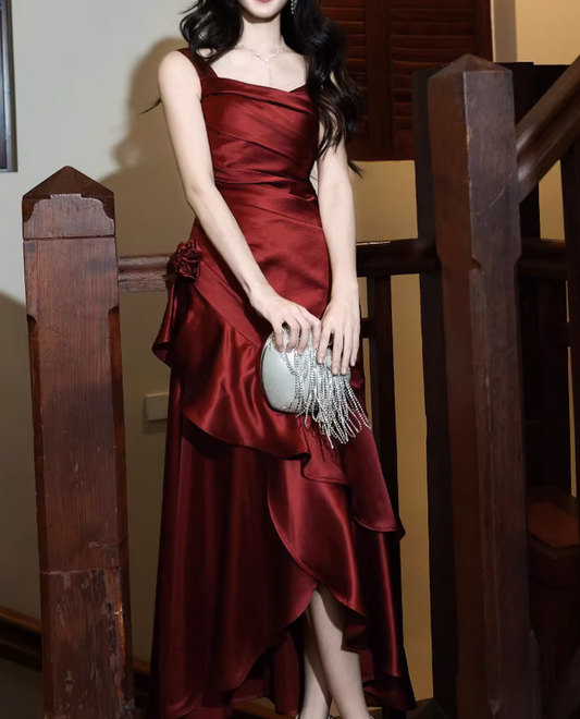 Gorgeous Sheath Long Prom Dresses Satin Sleeveless Formal Dresses Ruffle Burgundy Birthday Dresses DP3258