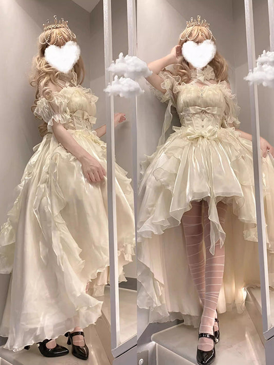 Beautiful High Low Off The Shoulder Short Sleeves Beige Rose Floral 16th Chiffon Birthday Dress Lolita Dress 18th Birthday Outfits W1242
