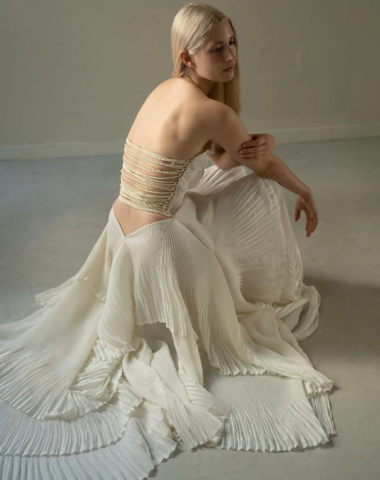 Chic Beige Pleated Strapless Contrast Color Stitching Prom Dress Long Prom Dresses DP241