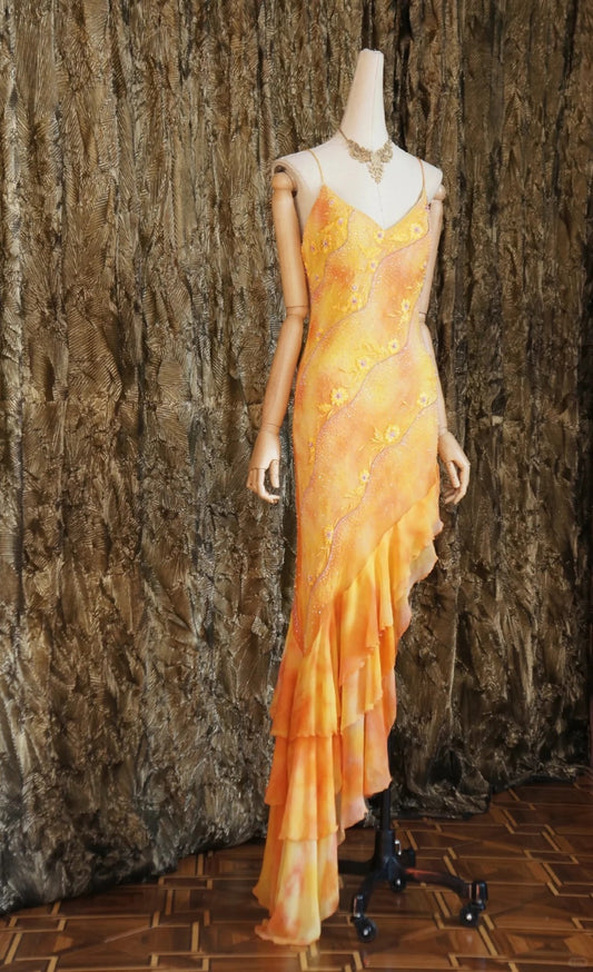 Vintage Spaghetti Strap Sheath Chiffon Beaded Long Yellow Evening Dress Sweet 16 Dress DP2902