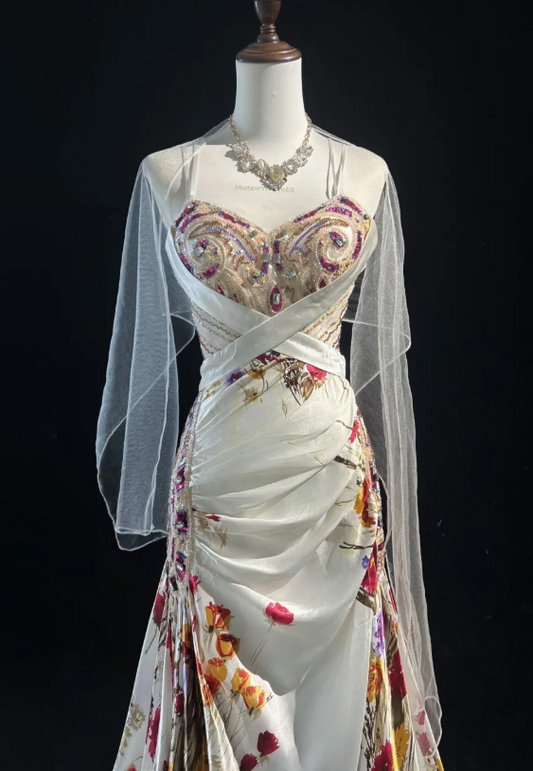 Vintage Spaghetti Strap Sheath Long Prom Dresses Floral Satin Sleeveless Evening Dress Sequin Champagne Formal Dresses DP3255