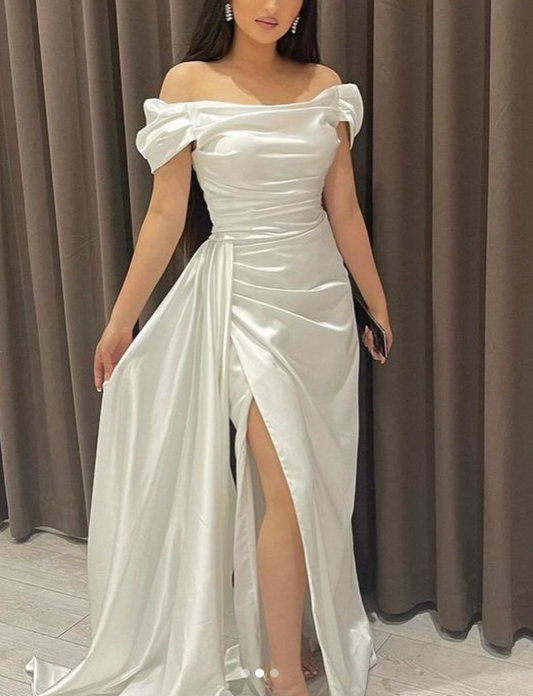 Classy Sheath Off The Shoulder White Slit Formal Long Prom Gown Summer Wedding Guest Dress Bridal Guest Dresses Wedding Outfits For Guest W1056
