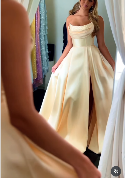 Modest A line Strapless Yellow Slit Satin 20th Birthday Dress Prom Dress 18th Birthday Outfits For Women W0170