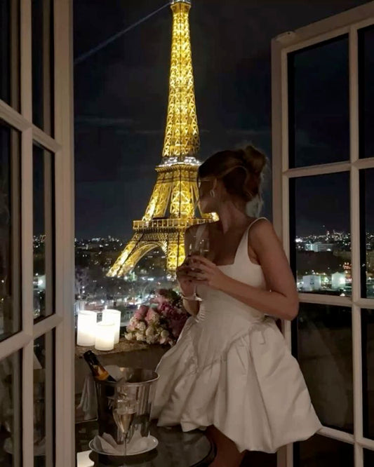 Cute A Line Square Neckline Ivory Satin Short Summer Birthday Dress Hoco Dress Birthday Outfit 18th Birthday Mini Party Dresses DP1100