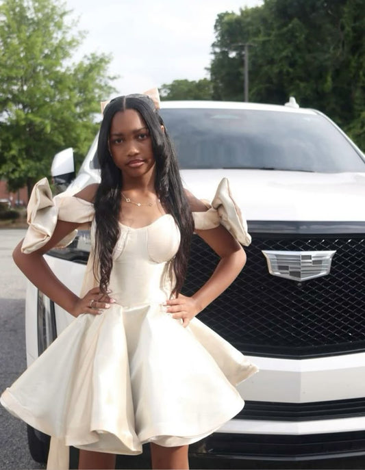 Pretty A line Off The Shoulder Satin Summer 16th Birthday Dress Hoco Dress Birthday Outfit 19th Birthday Mini Cocktail Dresses DH515