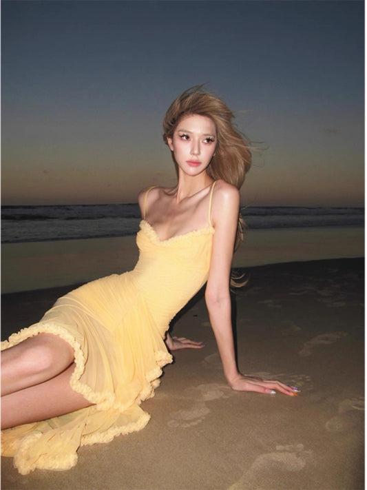 Sexy High Low Spaghetti Straps Yellow Long Birthday Dress Prom Dress Baddie Summer Birthday Outfit DP1024