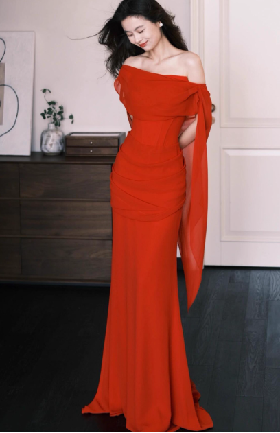 Elegant Off-shoulder Mermaid Chiffon Long Prom Dresses,Red Formal Evening Gowns DP3069