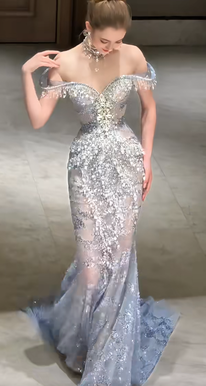 Elegant Mermaid Evening Dresses, Off-the-shoulder Tulle Beaded Long Formal Dresses DP2998