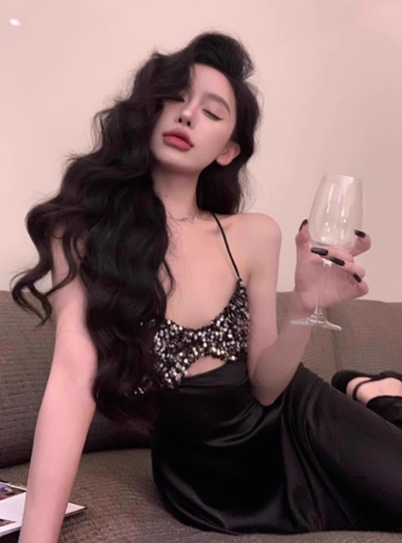 Modest Sheath Spaghetti Strap Long Evening Gown Black Formal Dress Elegant Sequin Satin Birthday Prom Dress DP2799