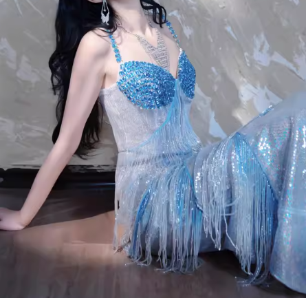 Modest Sheath Sweetheart Neck Long Evening Gown Blue Beaded Formal Dress Elegant Tassel Prom Dress DP2801