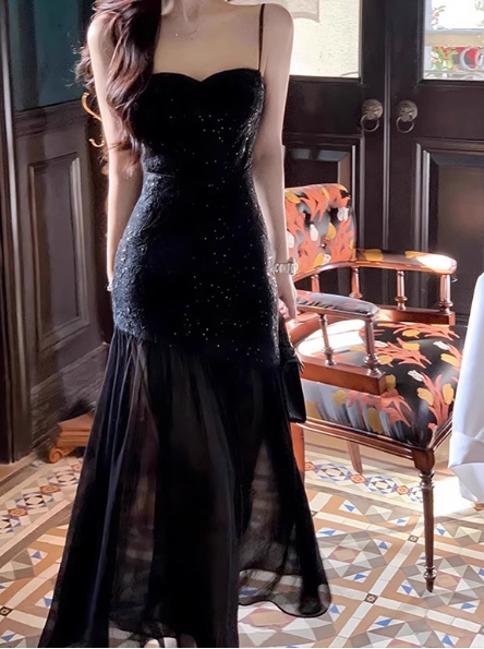 Stunning Mermaid V-neck Evening Gown Black Velvet Sequins Formal Dress Elegant Birthday Dress DP2806