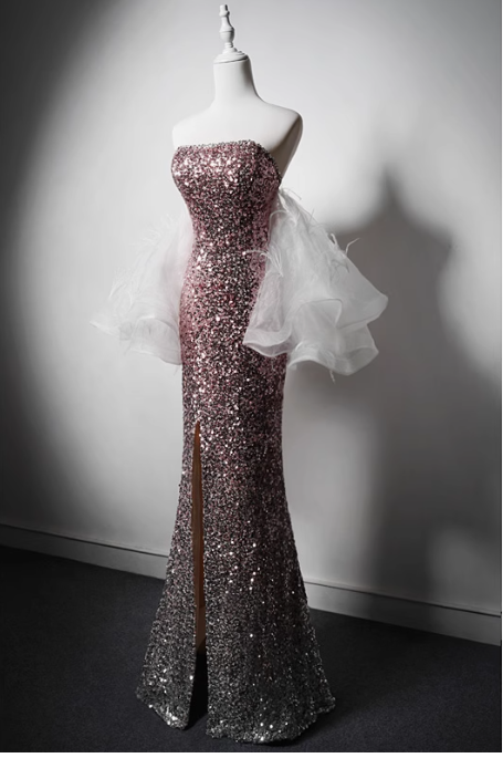 Modest Pink Mermaid Evening Gowns Strapless Slit Long Prom Dress Sparkly Sequins Graduation Dress DH2743