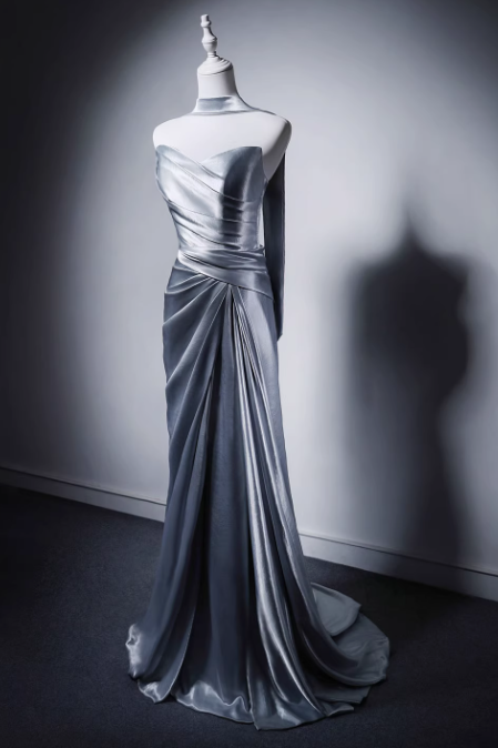 Elegant Light Gray Blue Mermaid Evening Gowns Strapless Satin Long Prom Dress Modest Sleeveless Formal Dress with Scarf DH2746