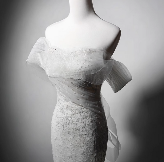 Elegant White Mermaid Evening Gowns Off-the-shoulder Tulle Long Prom Dress Modest Sleeveless Formal Dress DH2747