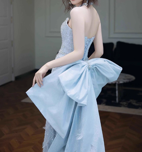 Elegant Light Gray Blue Strapless Long Evening Gowns A-Line 18th Birthday Dress Tulle Graduation Prom Dresses DH2750